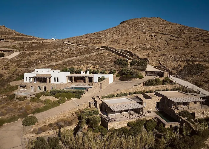 Featuring 2 outdoor swimming pools, a Turkish steam bath and a Jacuzzi, the 7-room Villa Amra - Secluded Mykonos Haven With Sea Views, Heated Pool, Gym & Hammam Ftelia invites guests to enjoy Ftelia, located approximately 25 minutes' walk away.